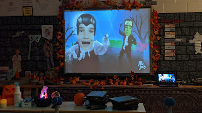 Take a peek at a few photos from our physical distance Halloween "party". Students watched themselves partying onscreen via Jibjab...since they couldn't in reality!